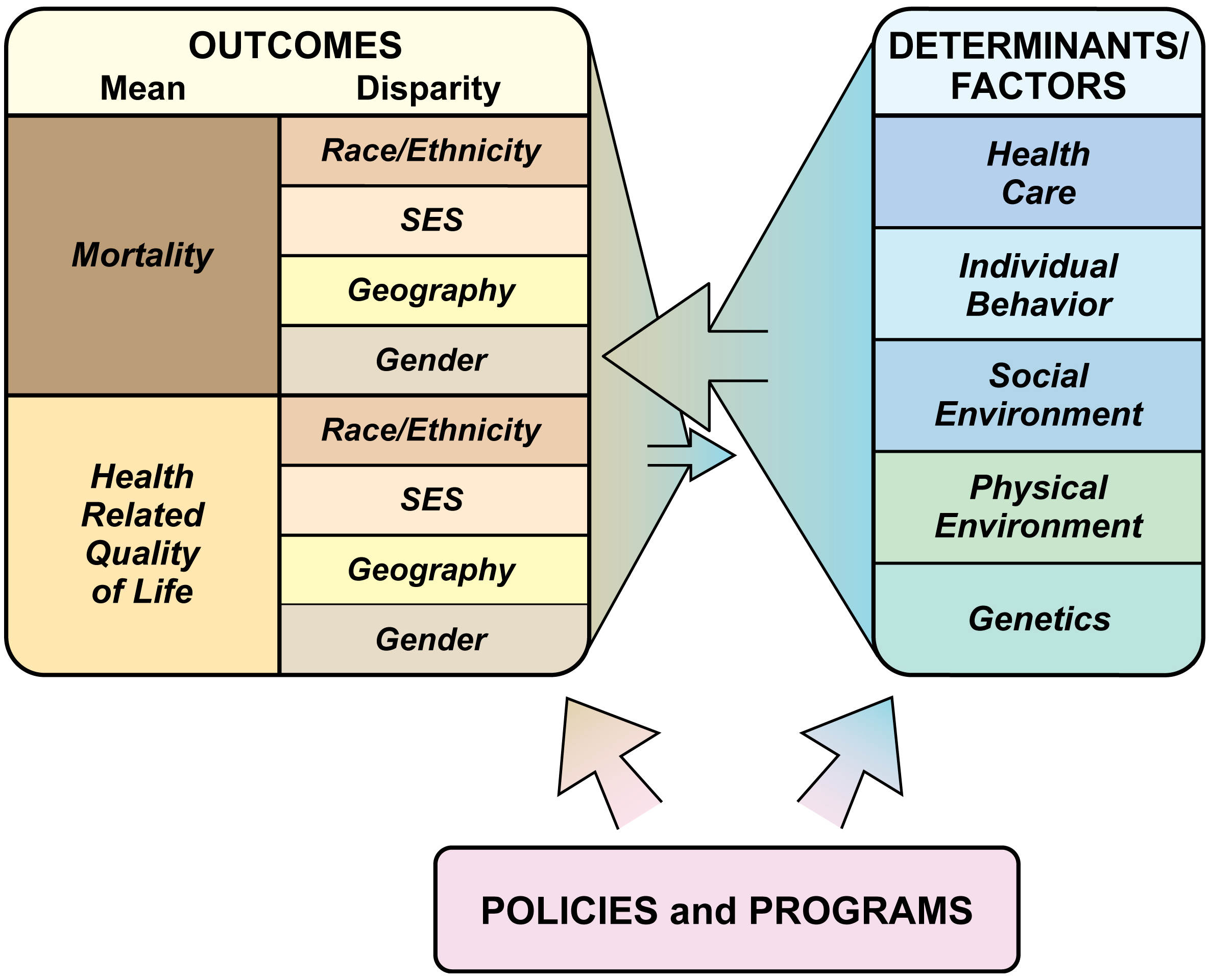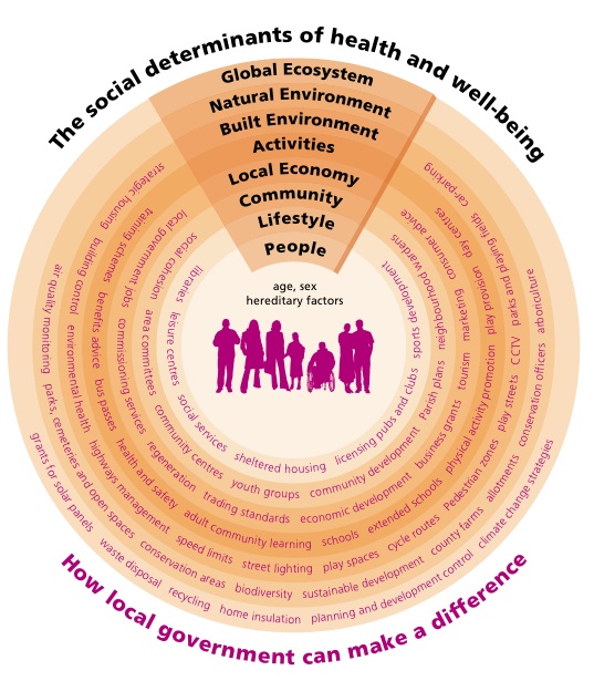 To those who have very little experience with public health, I present three images of population health, public health interventions, and the social determinants of health. The first diagram is of factors influencing population health.