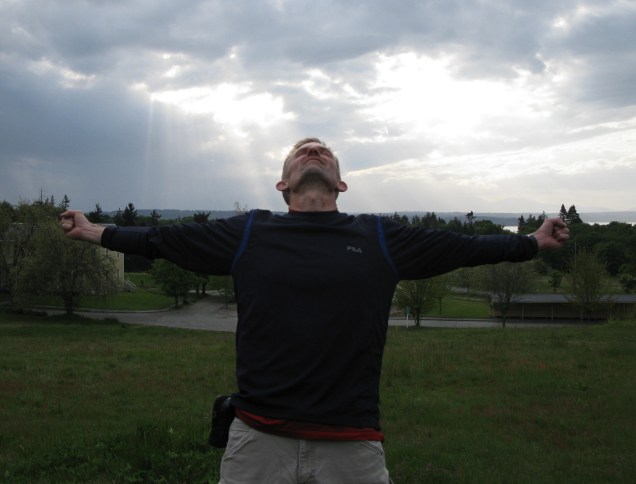 Rudy Owens, final day of coursework at the UW School of Public Health, turning to the heavens in thanks at Seattle’s Discovery Park (May 17, 2012).