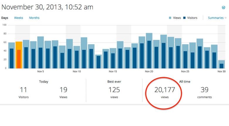 WordPress’s outstanding analytics tools provide a snapshot how many visitors and views have been recorded, in November 2013, and since I launched this blog in late March 2012.