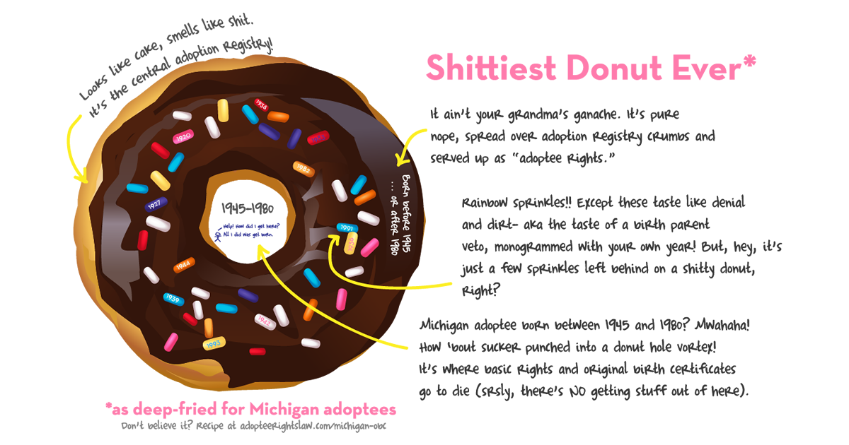 I will be promoting these very simple and mostly bureaucratic changes this week (first week of June 2018) when I head to Michigan and meet with lawmakers in person and tell them my story about being denied my identity and records by the state and its public healthy bureaucracy, simply because I was born a bastard and adoptee.
