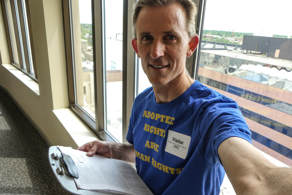 The Capitol-based reporter for the Detroit News, who I spoke to a day earlier in his office and who, coincidentally, was adopted and even sympathetic to the unequal legal treatment of adoptees, passed on my pitch for a story or interview. His job was to cover the “big bills,” not a little-known adoptee and author. He gave me a quick hello going to and from the Michigan Senate chambers that morning and let my story float by.