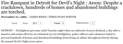 Mayor Coleman Young, the city’s first African American Mayor, has a controversial legacy from 1974 to 1994. The Wall Street Journal squarely blames him for the city’s decline that accelerated in the 1980s and 1990s. He is viewed by some, including the Detroit Free Press, for stoking racial flames. The Detroit Free Press however claims he was among the most frugal mayors and avoided debt, unlike his successors. My birth mother remembers him most for his inaction on Devil’s Night in 1989 and not stopping the first outbreak of widespread arson.