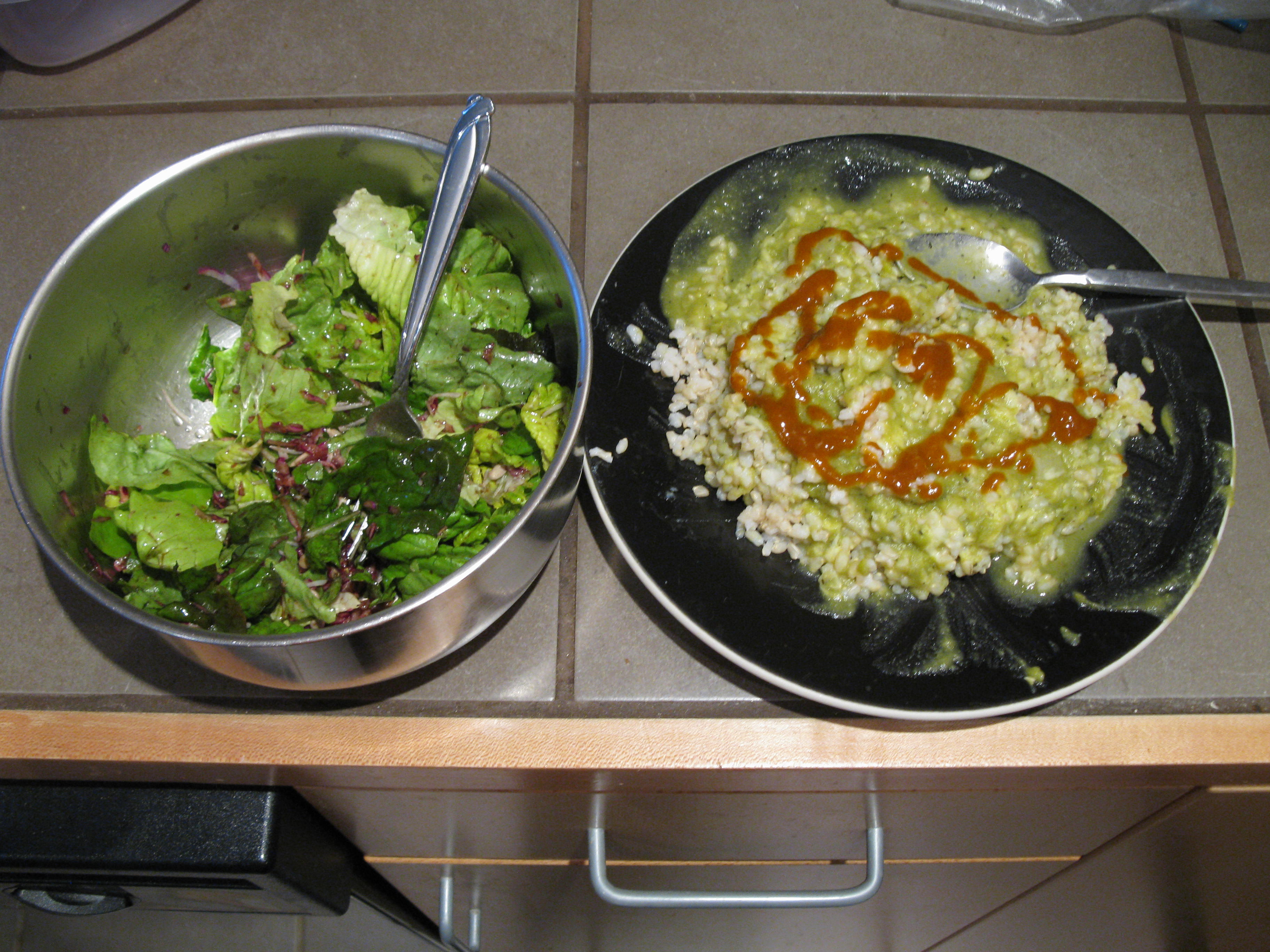 Split pea soup, organic brown rice, and redleaf lettuce and red cabbage salad -- very yum-yum.