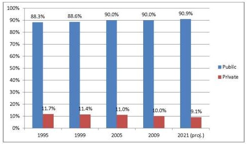 According to the U.S. Department of Education in 2008, the number of public schools in the United States outnumbered private schools (including religious schools) by about a 5-1 margin (65,990 vs. 13,864). In the past 15 years (1995-2009), private school enrollment actually dropped from 12% of all enrollment to less than 10%. The main reason is attributed to the drop in Catholic school enrollment.